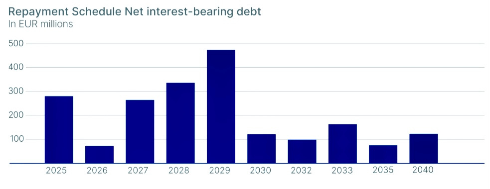 Net debt, excluding leases, is currently around €2.76B with 79% in fixed rate loans at an average yield of 4%. Below we can observe the maturity profile as of December 2024.