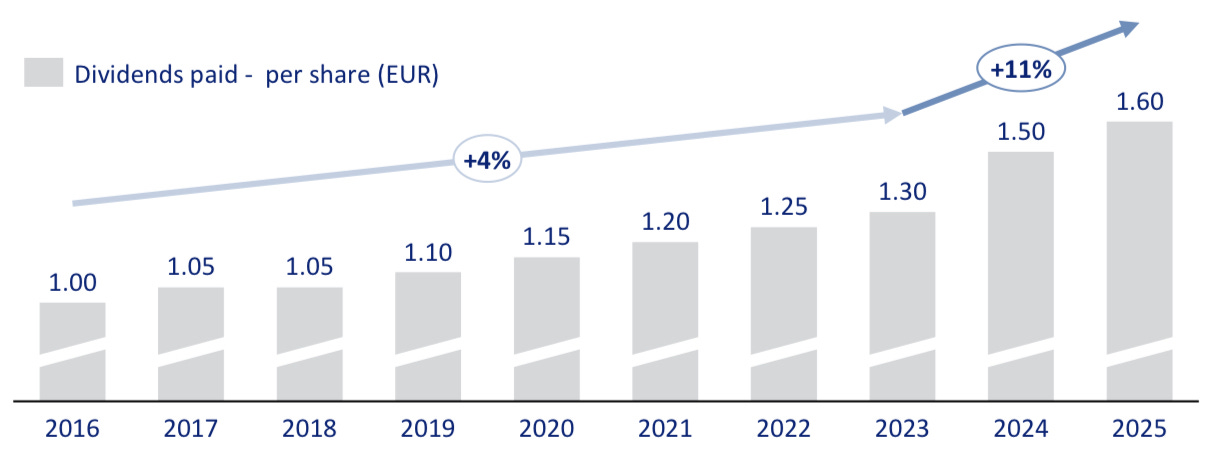 Using the full year 2025 guidance and the available year to date numbers, the target of €1.2B in proportional EBITDA and €300m in proportional operating CAPEX appears reasonable. Cash taxes and interest should be around €130m and €170m, while lease expenses, which include principal repayments, should come to about €110m. This brings us to roughly €500m of free cash flow. With 115.3m shares outstanding, free cash flow per share comes to about €4.33.