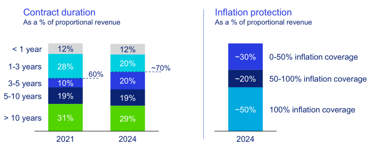 The core of Vopak’s business model is that the company invests capital upfront to build critical and irreplaceable infrastructure while signing contracts that secure ~70% of revenues for more than three years. Most of these contracts are indexed to inflation, which gives Vopak an advantage in an inflationary environment.