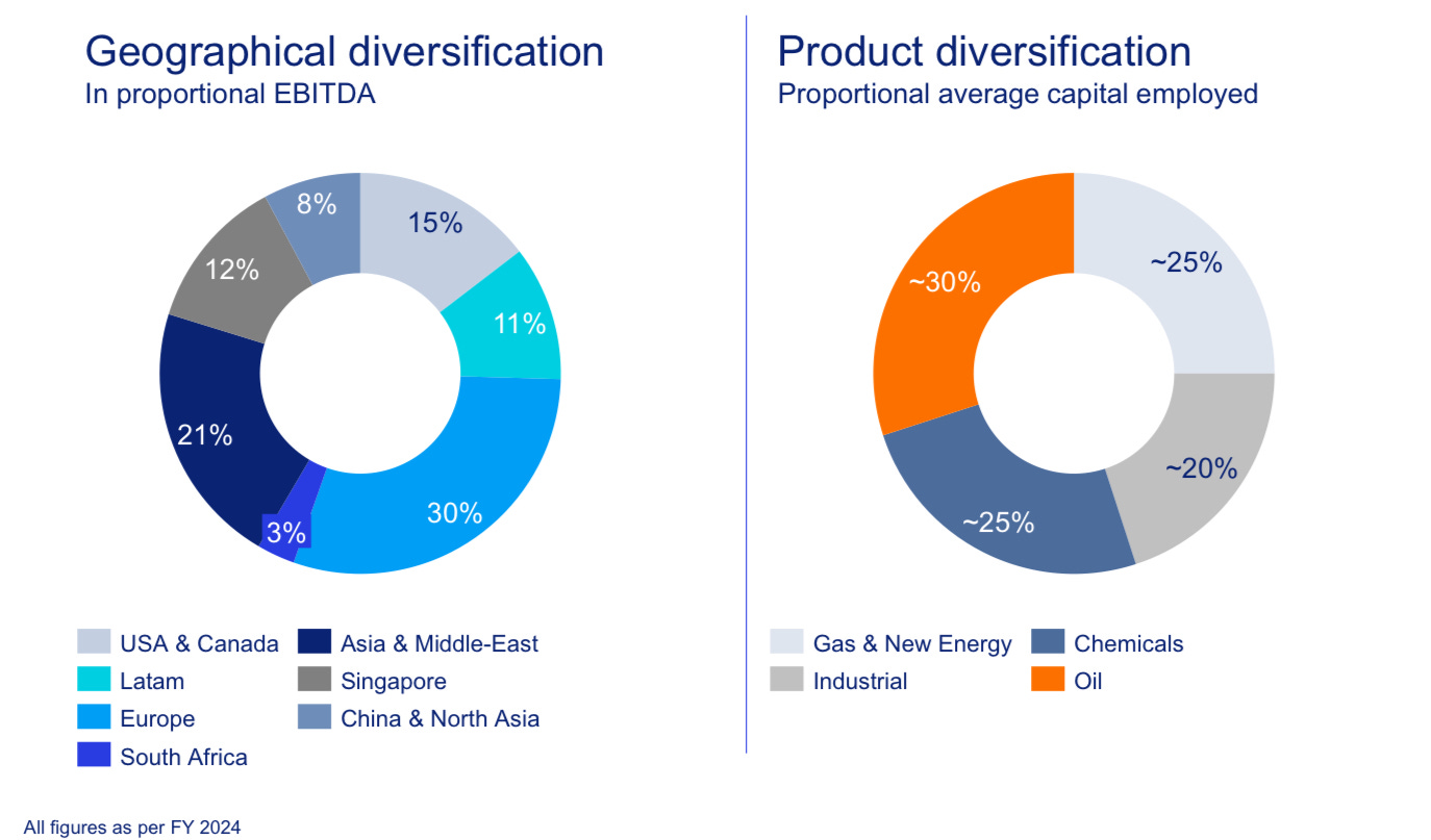 India is one of the fastest growing economies and one of the most expensive equity markets in the world. Through its joint venture with Aegis, named AVTL, Vopak owns 42.23% of the largest independent oil and gas storage company in the country. In the second quarter of 2025, AVTL went public and generated ~€110m for Vopak. The remaining 42.23% that Vopak still owns is currently worth about €1.18B, or roughly 27% of Vopak’s market cap.