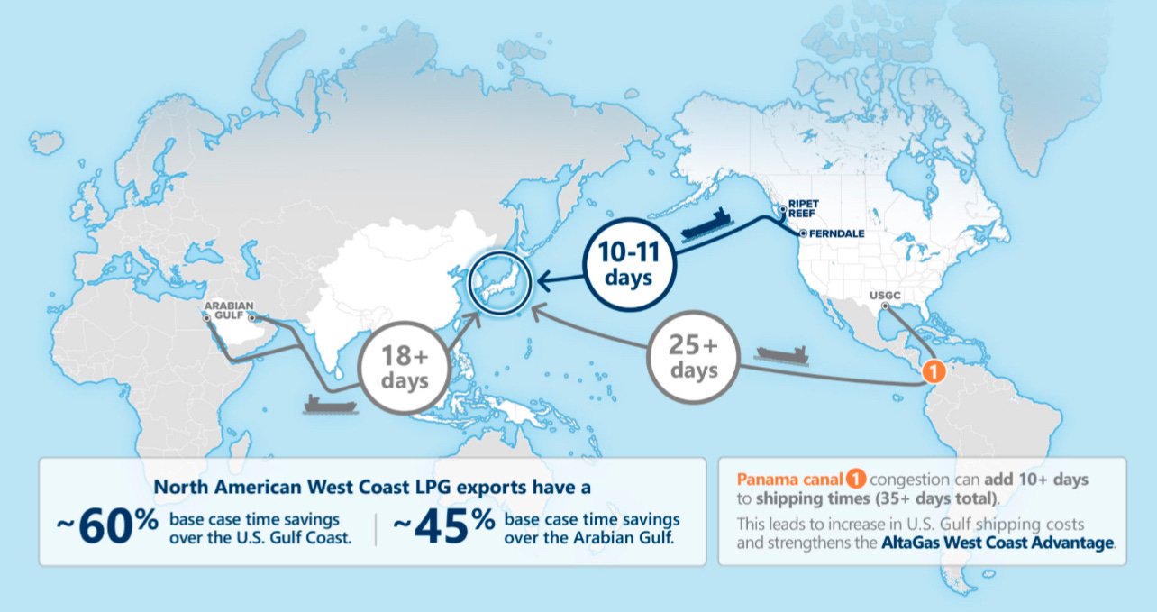 Shipping times give the region a structural advantage. It takes 10-11 days for a shipment to reach Japan or China. From Texas the same trip takes 25 days and from the Middle East ~18 days. This turns the Canadian west coast into a highly competitive export route for Asia.